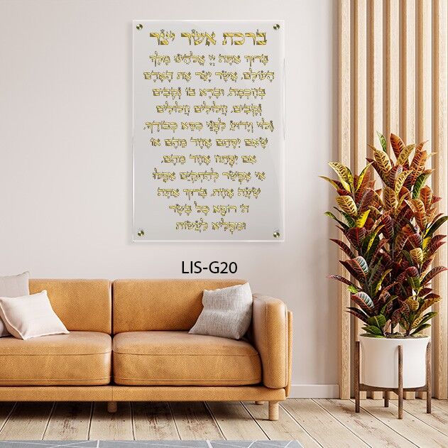 בחרו בדגם LIS-G20 והכניסו לחלל שלכם עוצמה עיצובית ועדינות רוחנית גם יחד, עם ברכת אשר יצר ברקע שקוף וכתב זהב.