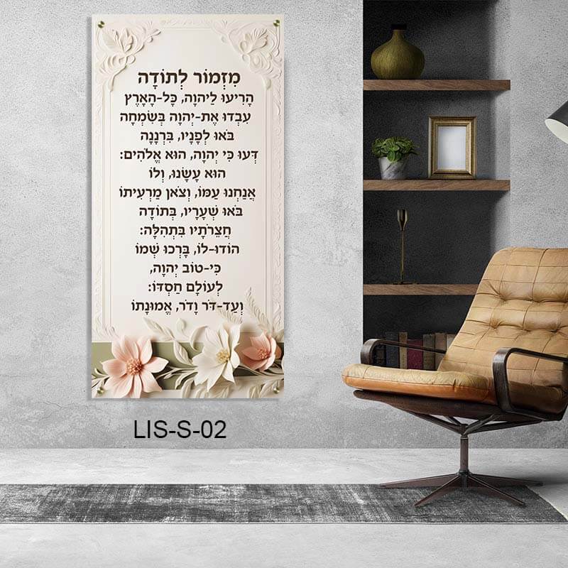 "מזמור לתודה" מעורר רגשות של הכרת הטוב, ושילובו בעיצוב פרחוני עדין ורקע בגוון שמנת יוצר אווירה מעודנת ורומנטית. היא מתאימה לסלון, לפינת אוכל, לחדר השינה או למשרד, ומאפשרת להכניס נגיעת חום ורוחניות לכל פינה בבית.