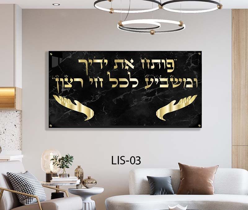 "פותח את ידיך" הוא פסוק המבטא את תלותנו בשפע האלוקי והכרת התודה שלנו. כשפסוק זה מודפס על זכוכית שחורה עם כתב זהב, נוצרת יצירה מעוצבת ורבת עוצמה המשדרת אמונה ואלגנטיות גם יחד.