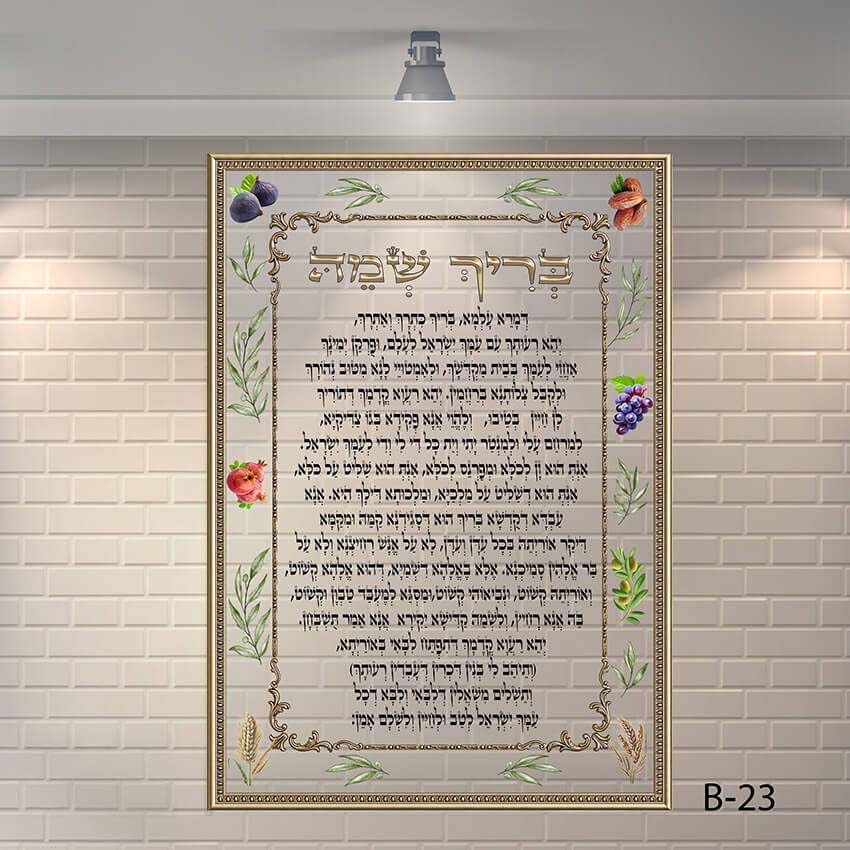 שלטים לבית כנסת מזכוכית עם נוסח תפילת "בריך שמיה" המלא, מודפס על זכוכית מחוסמת Extra Clear בעובי 6 מ"מ באיכות גבוהה. עיצוב מרהיב הכולל: