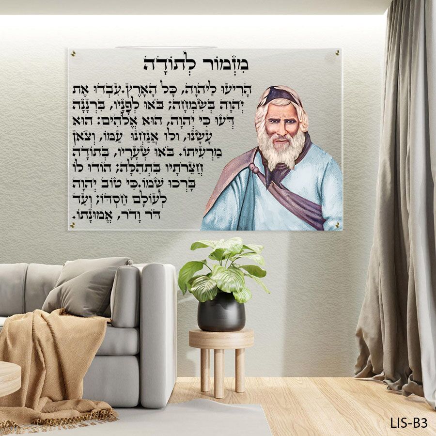 בתמונה נראה הרב יעקב אבוחצירא (אביר יעקב), ומאחוריו מופיעה מזמור לתודה בכתב שחור אלגנטי על רקע שקוף. ההדפסה הישירה על זכוכית מחוסמת אקסטרה קליר בעובי 6 מ"מ מבטיחה איכות הדפסה גבוהה, ברק מרהיב ותחזוקה פשוטה, שיהפכו כל חלל בבית או במשרד למקום של השראה ושמחה.
