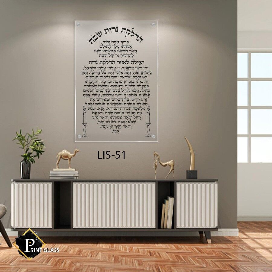 התמונה מציגה את ברכת הדלקת נרות עם פמוטים וכתב שחור, על רקע שקוף ומהודר. ההדפסה הישירה על זכוכית מחוסמת אקסטרה קליר בעובי 6 מ"מ מבטיחה איכות גבוהה, עמידות לאורך זמן וברק ייחודי שימשוך את העין בכל סגנון עיצוב שתבחרו – סלון, פינת אוכל, או אפילו מטבח וחדר משפחה.