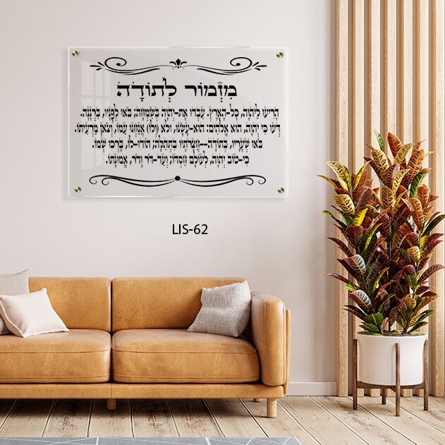 מזמור לתודה מבטא שמחה והודיה, והשילוב בין הרקע השקוף לכתב השחור מעניק מראה קליל, מודרני ופשוט לשילוב בכל חלל. התוצאה היא תמונה בעלת ערך רוחני ועיצובי גם יחד, המקרינה השראה ואווירה חיובית.