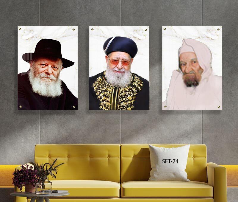 הסט כולל שלוש תמונות זכוכית נפרדות, המציגות את דמויותיהם של רבנים נערצים בצבעוניות עשירה על רקע שיש לבן אלגנטי: