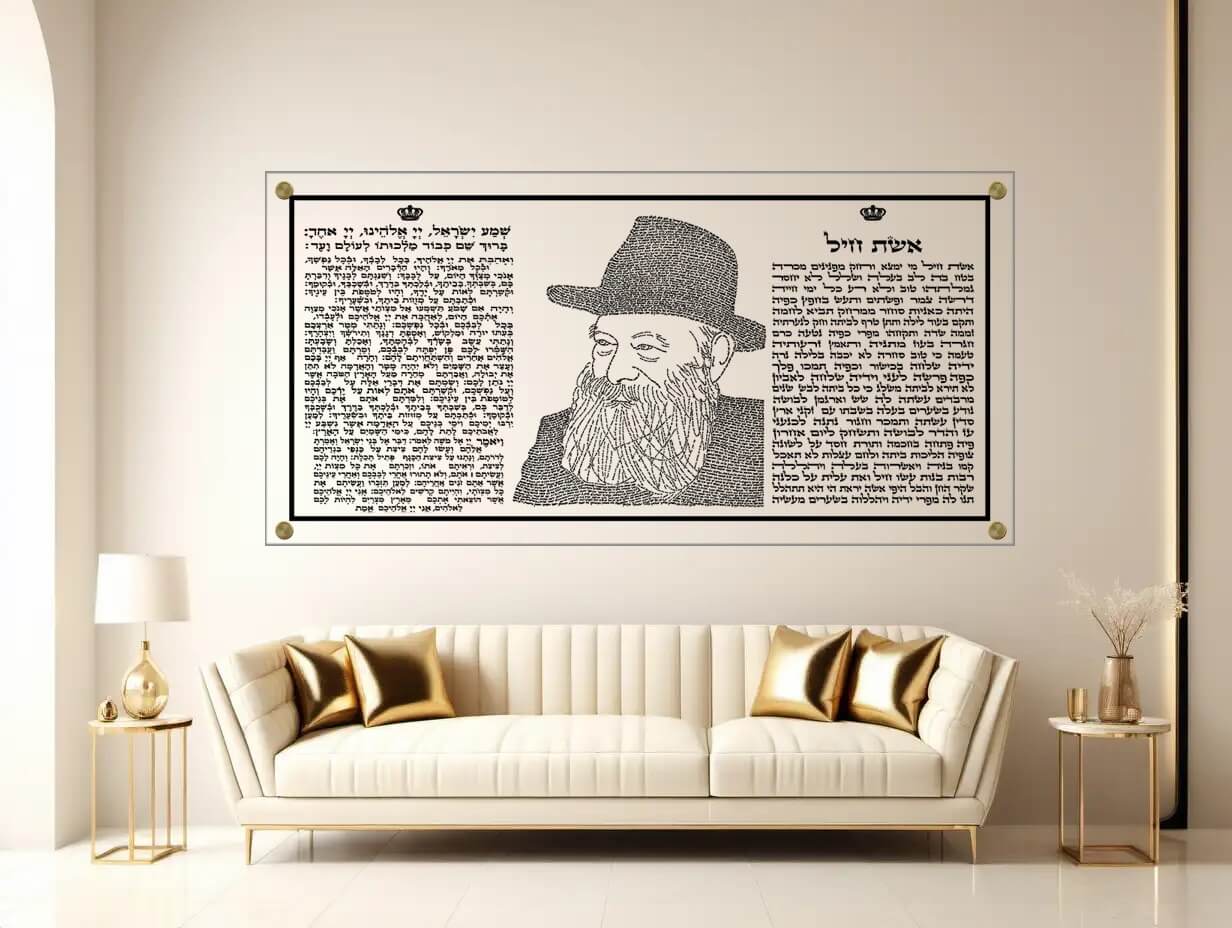 יצירה אלגנטית של אומנות יודאיקה תמונות: טקסט אשת חיל מודפס בשחור בשני צידי הזכוכית, ובמרכז דיוקן בעיפרון של הרבי מליובאוויטש – עדין, מאיר ומכבד. הרקע השקוף מאפשר לקיר שלכם להיכנס לקומפוזיציה, ולכן זו בחירה טבעית בקטגוריית תמונות יודאיקה, מושלמת כ־תמונות יודאיקה לסלון וכאבן פינה בקולקציית תמונות יודאיקה לבית.