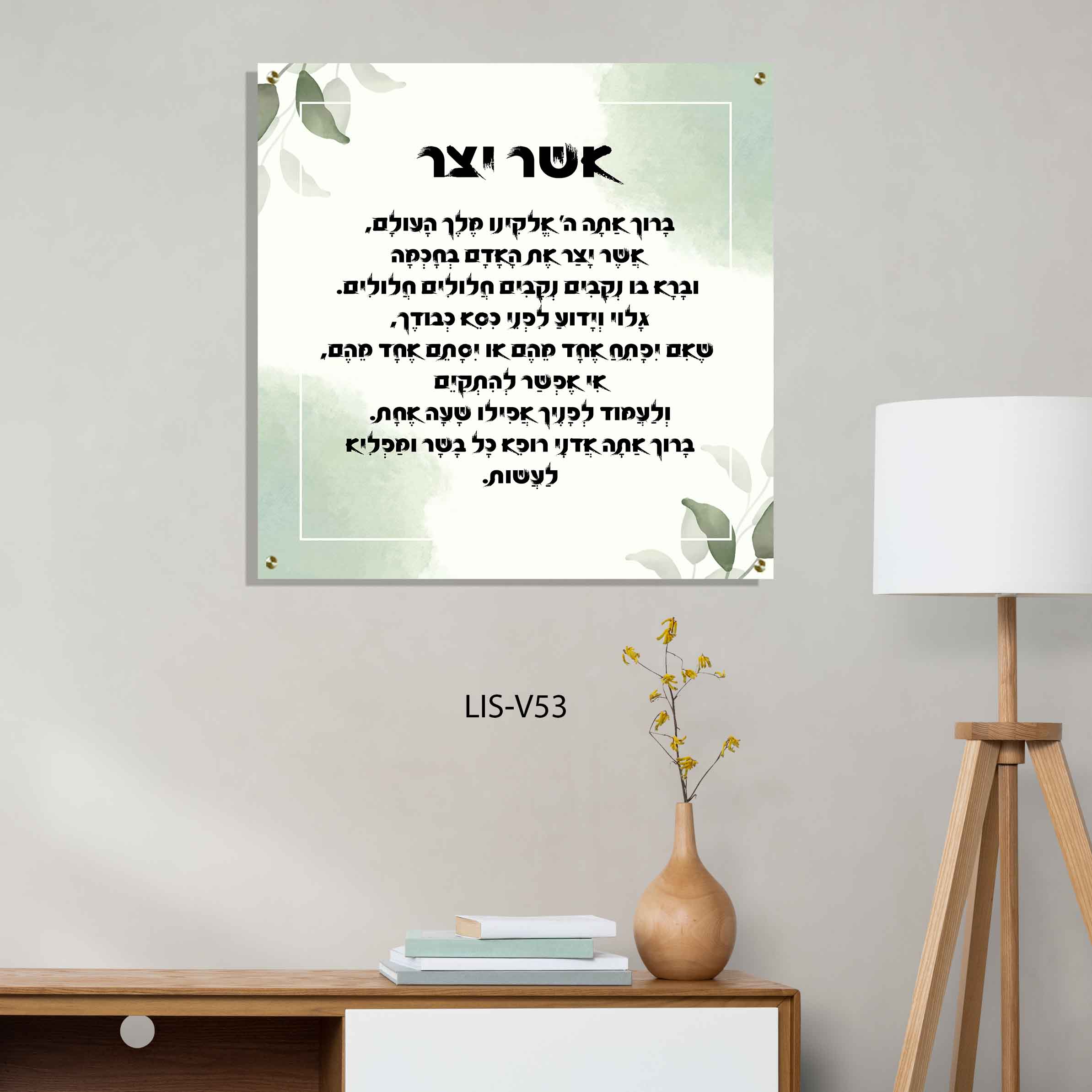 תמונת זכוכית מרהיבה המציגה את נוסח ברכת אשר יצר על רקע בגווני ירוק ולבן, עם עננים בהירים ועלים ירוקים משני צידי הטקסט.