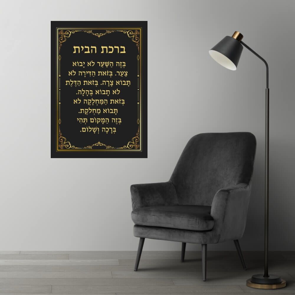 השילוב של הרקע השחור החלק, יחד עם הכתב הזהוב והמסגרת המעוטרת, מייצר אווירה מרשימה השומרת על קו עיצובי אלגנטי. ברכת הבית מכניסה ערך מוסף רוחני ומעשי, המחבר בין עיצוב עדכני למסורת היהודית. זוהי תוספת מושלמת לכל חדר מגורים, משרד או פינת אירוח, המעניקה חמימות וברכה.