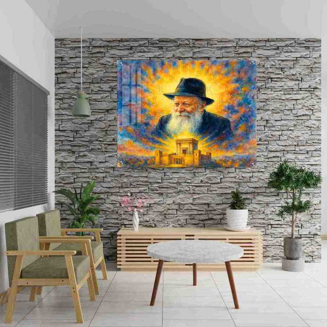 תמונה של הרבי מליובאוויטש זצ"ל (רבי מנחם מנדל שניאורסון) בעיצוב אומנותי ומרשים במיוחד, מודפסת על זכוכית מחוסמת Extra Clear בעובי 6 מ"מ. התמונה משלבת דיוקן עוצמתי של הרבי עם רקע אבסטרקטי עשיר ובית המקדש בתחתית – יצירה שמחברת השראה חזותית עם תוכן רוחני עמוק.