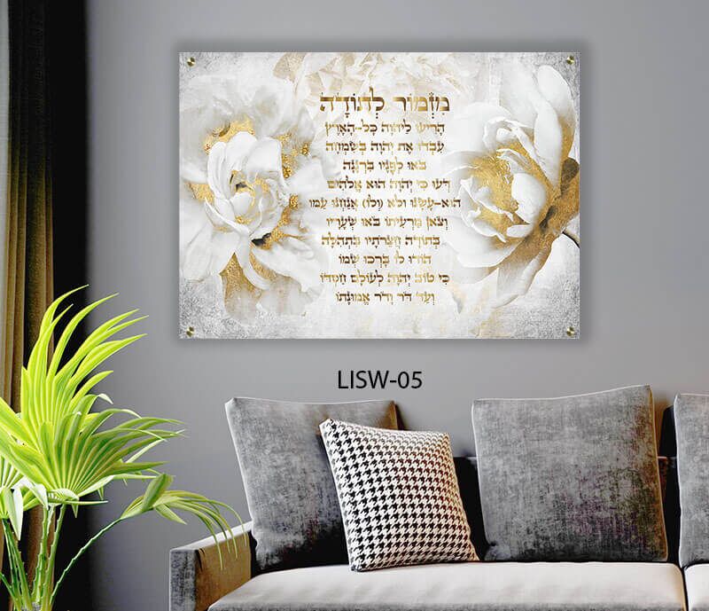 מזמור לתודה ידוע כמזמור המביע שמחה והכרת הטוב. בשילוב הרקע האבסטרקטי בגווני זהב ולבן, נוצרת יצירה אומנותית המשלבת רוחניות ואסתטיקה עכשווית. פריט עיצובי זה משתלב נהדר בחללים מגוונים – מהסלון ועד המשרד – ומכניס אווירה של הודיה וברכה בכל מבט.