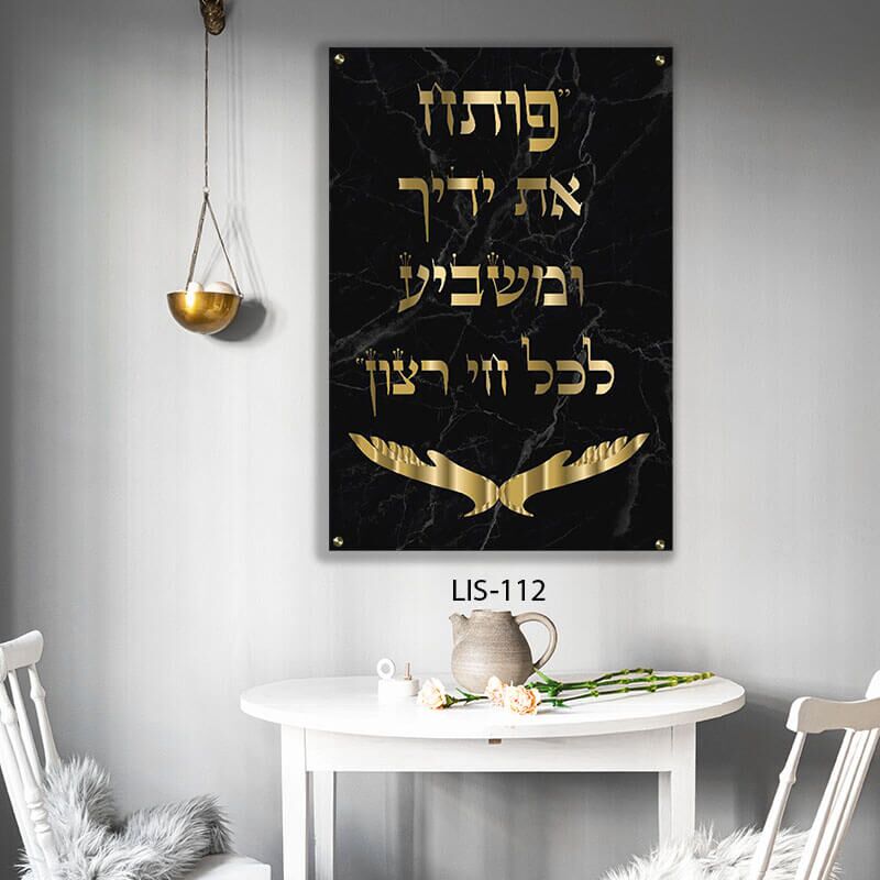 התמונה מציגה את פסוק "פותח את ידייך" בכתב זהב, על רקע שחור יוקרתי, ומודפסת ישירות על זכוכית מחוסמת אקסטרה קליר בעובי 6 מ"מ. שילוב הצבעים הדרמטי והגימור המבריק של הזכוכית יוצרים יחד מראה מרשים, המתאים לכל חלל – מסלון ביתי ועד פינת העבודה.