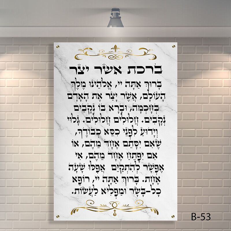 הכניסו את תדר ההודיה, הבריאות והשמירה אל המרחב שלכם עם יצירת אומנות נקייה, אלגנטית ומלאת משמעות. היצירה מציגה את "ברכת אשר יצר" – הברכה היהודית העוצמתית ביותר להודיה על פלא גוף האדם ובקשה לבריאות איתנה, מעוצבת באותיות סת"ם שחורות, מנוקדות וקריאות להפליא, על גבי רקע לבן וטהור.