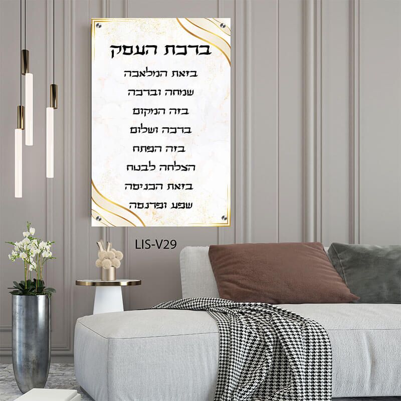 דגם LIS-V29 מציג את נוסח ברכת העסק המסורתי בכתב שחור חד וברור, על רקע לבן חלק עם עיטורים מוזהבים מרהיבים בשולי התמונה. ההדפסה מבוצעת על זכוכית אקסטרה קליר מחוסמת בעובי 6 מ"מ, באיכות הדפסה גבוהה במיוחד המבטיחה עמידות לאורך שנים.