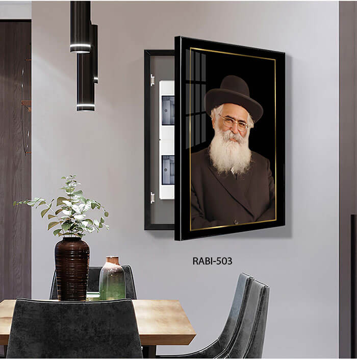 דמותו המאירה של הרב בולטת באצילות על גבי רקע שחור, עמוק ויוקרתי, התחום במסגרת פנימית ודקה של זהב המעניקה למכלול מראה דרמטי ומהודר. הפתרון החכם הזה מאפשר לכם להסתיר את ארון החשמל או התקשורת (שפעמים רבות פוגם בעיצוב מבואת הכניסה, פינת האוכל או המסדרון), ולהחליפו בתמונה של צדיקים המשרה בחלל אווירה של קדושה, עין טובה וברכה מתמדת. מנגנון הפתיחה דמוי-הדלת מאפשר גישה מהירה, נוחה ובטוחה ללוח המפסקים בכל עת שנדרש, מבלי להתפשר על האסתטיקה של הבית.