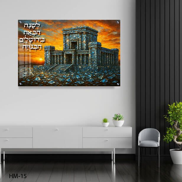 הכניסו את אווירת הקדושה והפאר של בית המקדש לביתכם עם ציור ייחודי ביופיו. התמונה מציגה את בית המקדש בעיצוב בסגנון יהלומים בגוונים כהים ועוצמתיים. ברקע, שמיים בגוונים חמים של שקיעה. המדגישים את הפאר והרוחניות של המקום הקדוש.