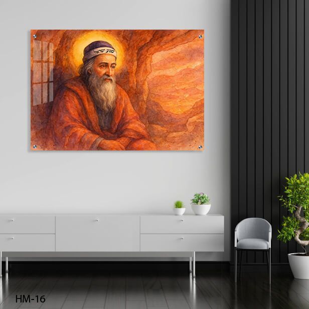 הכניסו לביתכם אווירת קדושה וחמימות יהודית עם ציור מרהיב של הצדיק רבי שמעון בר יוחאי. התמונה מתארת את רבי שמעון יושב במערה, שקוע בהתבוננות רוחנית ולימוד תורה. הרקע מאופיין בצבעים חמים ועשירים של שקיעה, היוצרים תחושה של שלווה, רוחניות ועומק.