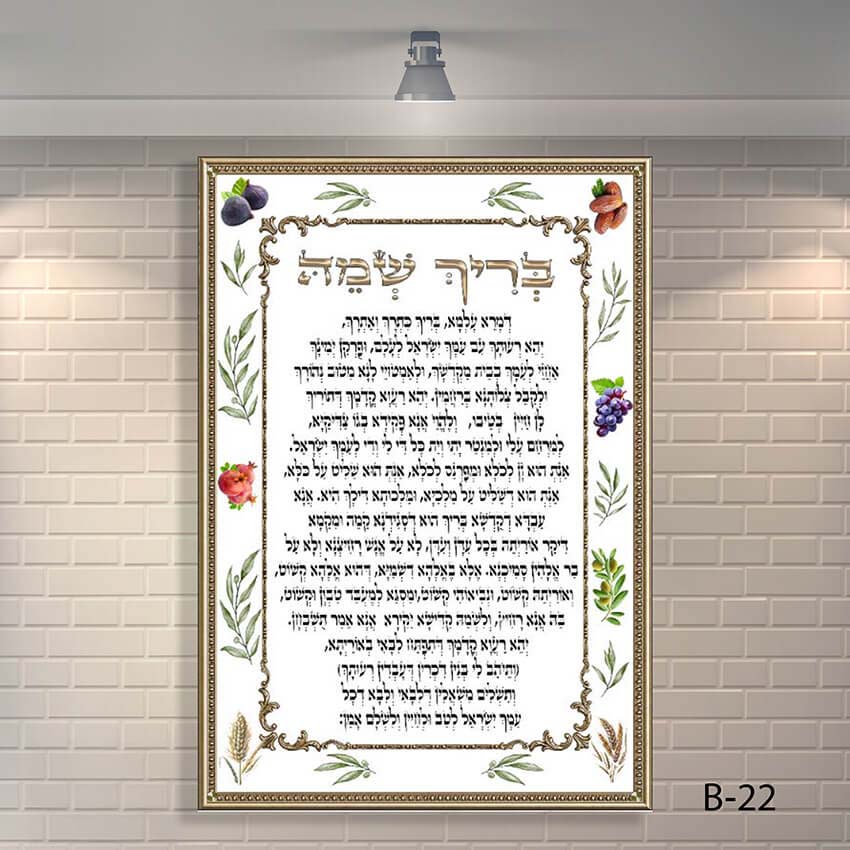 רקע לבן חלק, טקסט שחור קריא, כותרת מוזהבת מודגשת, ומסגרת כפולה בצבע זהב שבתוכה שזורים שבעת המינים – עיצוב עשיר שמשלב שפע יהודי, רוחניות וקדושה במקום אחד.