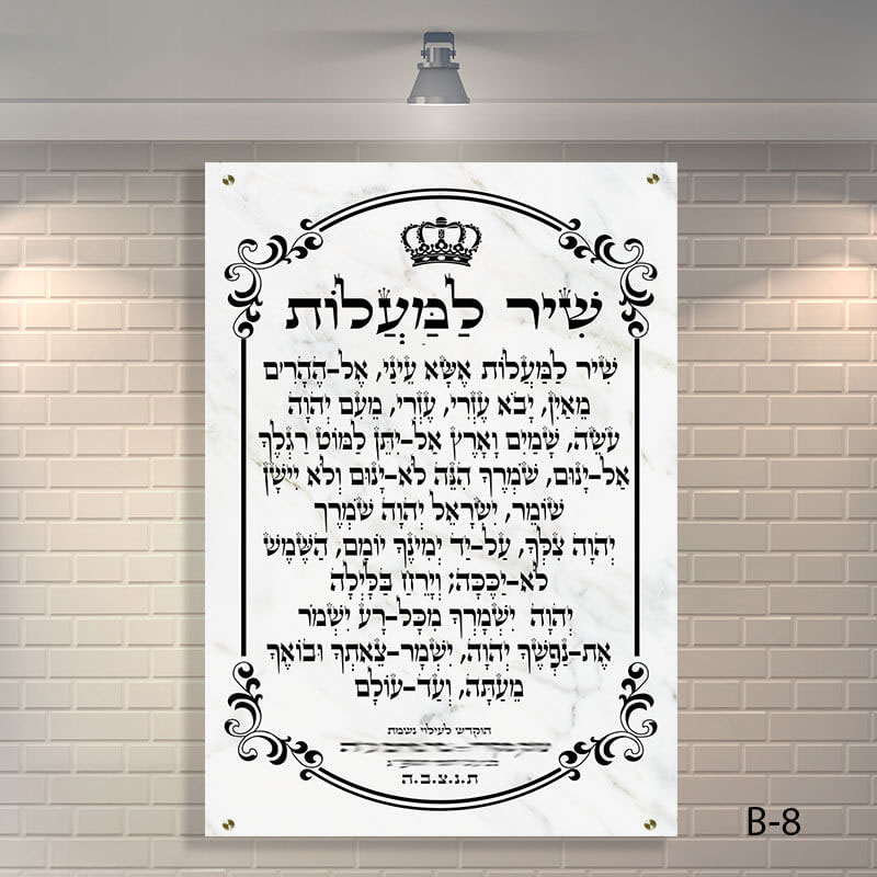 שלט זכוכית של "שיר למעלות" – דגם B-8 הוא פריט אומנות יהודית מרגש ועמוק, המכניס קדושה, עוצמה ואמונה לחלל התפילה – בעיצוב מודרני שמכבד את המקום ואת הפסוקים.
