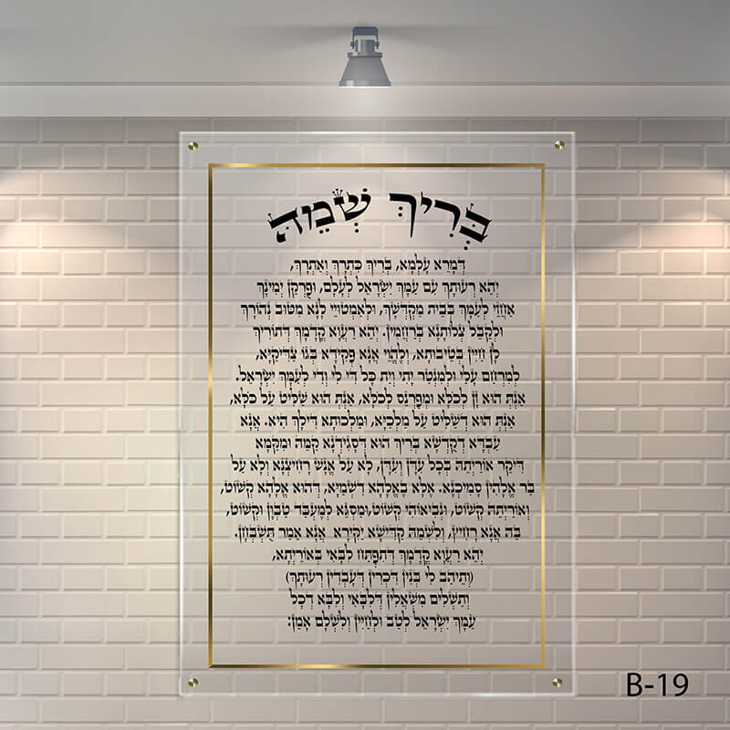 שלטים לבית כנסת מזכוכית עם נוסח "בריך שמיה" – תפילה מהזוהר הקדוש – מודפס באיכות גבוהה על זכוכית מחוסמת Extra Clear בעובי 6 מ"מ. העיצוב כולל רקע שקוף נקי, מסגרת זהב עדינה וכותרת בכתב שחור, למראה מהודר, מרומם ומתאים לכל קיר בבית הכנסת או בכניסה לארון הקודש.