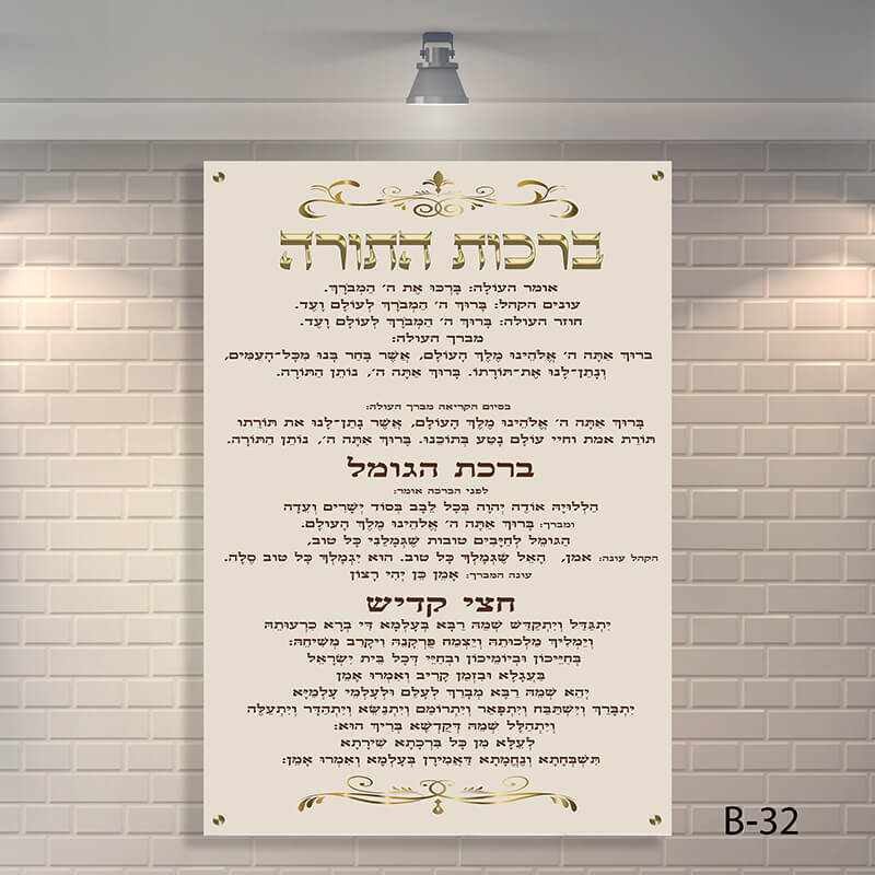 שלט "ברכת התורה" – דגם B-32 הוא שילוב מושלם של תוכן רוחני עמוק עם עיצוב קלאסי ונעים – פריט חובה לכל בית כנסת שמעוניין לשדר קדושה, איכות ויוקרה.