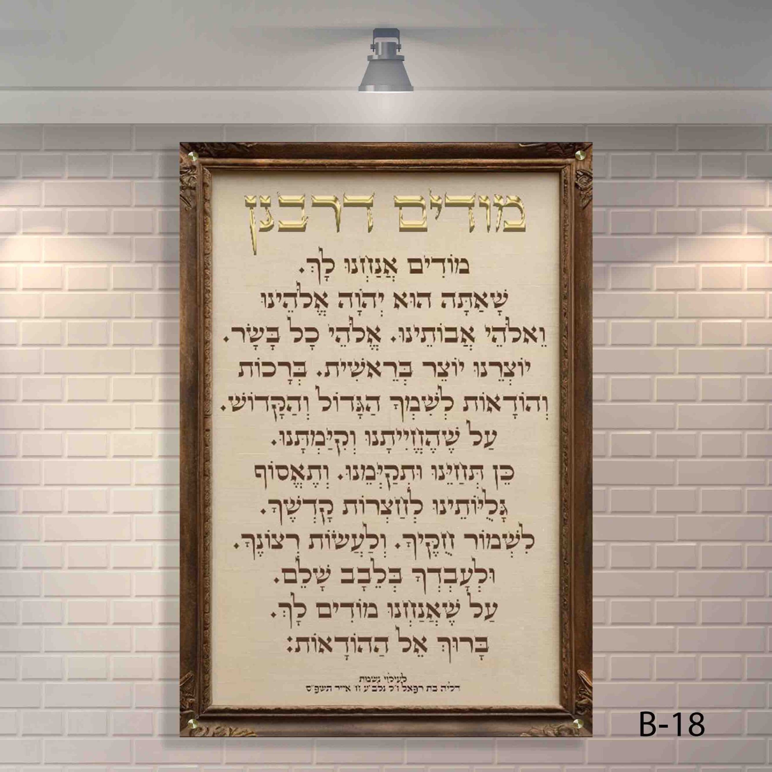 שלט זכוכית "מודים דרבנן" – דגם B-18 משלב עומק רוחני עם עיצוב הרמוני וחמים – פריט חובה לכל קיר תפילה בבית הכנסת שמחפש גם תוכן וגם יופי.