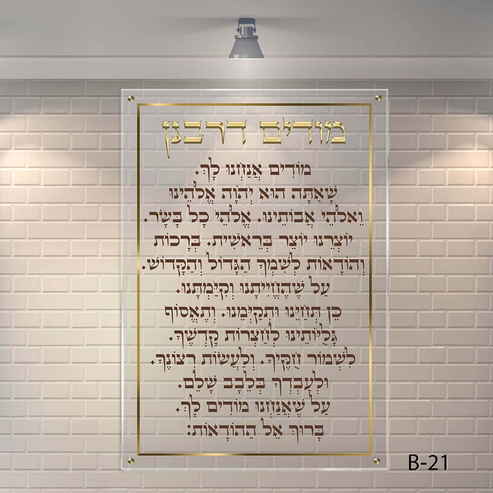 שלט זכוכית מודים דרבנן – דגם B-21 משלב תוכן מסורתי עמוק עם עיצוב אלגנטי ונראות יוצאת דופן – בחירה מושלמת לכל בית כנסת שמעוניין לייחד את קירותיו בתוכן קדוש ומרומם.