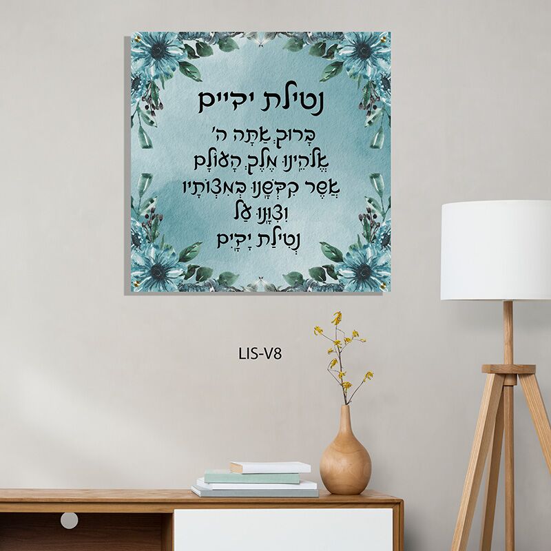 במרכז התמונה מופיעה ברכת נטילת ידיים בכתב ברור ואלגנטי, מוקפת בעיטורים פרחוניים מעודנים. הרקע בטון ירוק טורקיז מעניק תחושת רעננות והרמוניה, והוא מתאים במיוחד לתלייה פינת הנטילה או כל אזור שתרצו להכניס אליו אווירה של טהרה ויופי.
