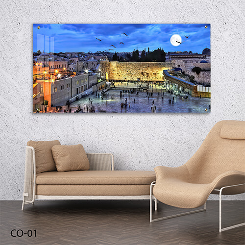 הכניסו את קדושת ירושלים, הנצח והכיסופים אל לב הסלון שלכם עם תמונה של הכותל המערבי עוצרת נשימה. היצירה מציגה מראה פנורמי לילי ומרהיב של רחבת הכותל, בו האבנים העתיקות מוארות באור זהוב וחם המנוגד לכחול העמוק של שמי הלילה והירח המלא. המראה המואר והצלול משרה בבית אווירה של רוממות רוח, תפילה ושלווה אינסופית.