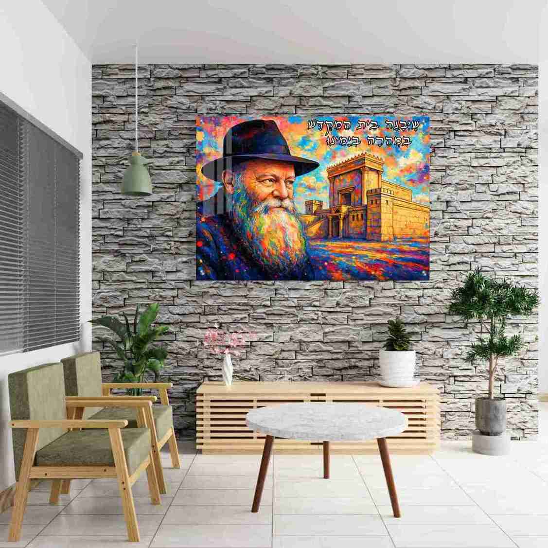 תמונה עוצמתית ומלאת צבע של הרבי מלובביץ זצ"ל, מודפסת על זכוכית מחוסמת Extra Clear בעובי 6 מ"מ, בעיצוב מרהיב בסגנון פופ ארט צבעוני. ברקע נראית דמותו המוארת של הרבי באווירה מודרנית וסוחפת, ובאופק – הדמיה של בית המקדש עם הכיתוב האופטימי והמוכר: "שיבנה בית המקדש במהרה בימינו".