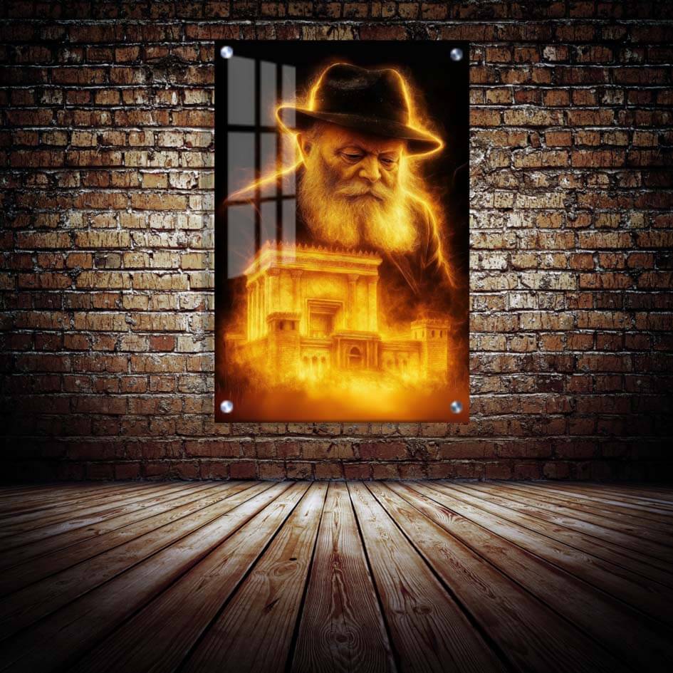 דיוקן עוצמתי של הרבי מליובאוויטש על רקע שחור עמוק. עם הילה זוהרת של להבות סביב הדמות וברקע בית המקדש מאיר באש עדינה. זו יצירה שמחברת קדושה ואמנות עכשווית – בחירה מדויקת לכל מי שמחפש תמונות של צדיקים לבית בעיצוב נקי ויוקרתי.