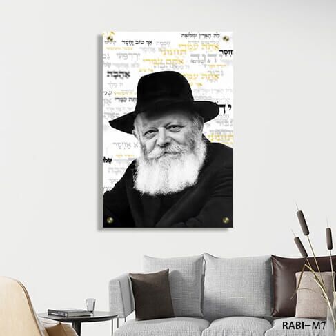 דגם RABI-M7 הוא הרבי מלובביץ תמונה שמציגה דיוקן מאיר על רקע מילים טהורות.