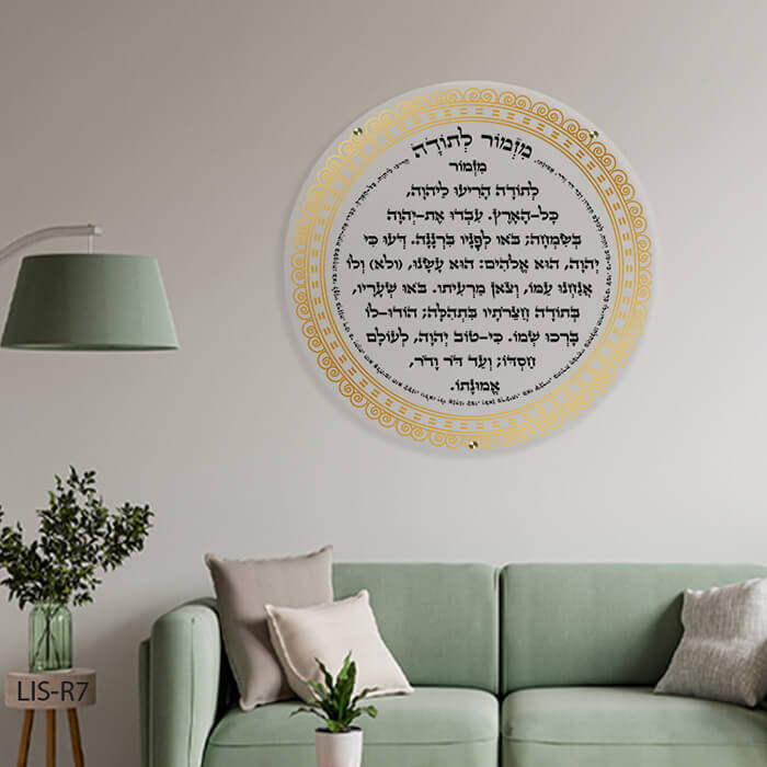 הקוטר העגול והשקוף משתלבים טבעית עם צבע הקיר ועם חומרים כמו עץ טבעי. בטון בהיר או מטאל שחור. לכן היא עובדת נהדר כ־תמונת בית מזמור לתודה יחידנית מעל קונסולה, וגם כחלק מגלריה של תמונות יודאיקה לבית. מי שמחפש במיוחד מזמור לתודה תמונה או אוסף תמונות של מזמור לתודה ימצא כאן קומפוזיציה קריאה, אלגנטית ומדויקת.