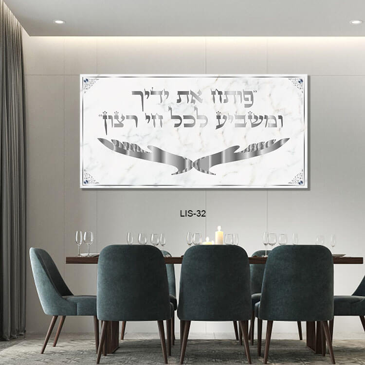 הפסוק "פותח את ידייך" מזכיר בכל יום את השפע האלוקי והברכה שיכול להגיע לכל אחד מאיתנו. כאשר הוא משולב בעיצוב נקי של שיש לבן וכתב כסף, נוצרת אווירה מעודנת ואלגנטית המעלה את תחושת השלווה והרוחניות בחדר.