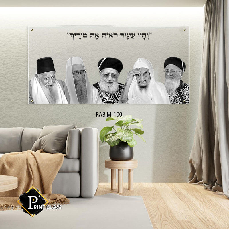 על גבי רקע אפרפר-בהיר ומינימליסטי, מופיעות דמויותיהם הקדושות של הצדיקים בעיבוד שחור-לבן אומנותי, עמוק ומרגש (מימין לשמאל): המקובל והראשון לציון הרב מרדכי אליהו, סדנא הבבא סאלי (רבי ישראל אבוחצירא), מרן שר התורה הרב עובדיה יוסף, הרב יאשיהו יוסף פינטו, וזקן המקובלים הרב יצחק כדורי זיע"א. מעליהם מתנוסס הפסוק העוצמתי "וְהָיוּ עֵינֶיךָ רֹאוֹת אֶת מוֹרֶיךָ" באותיות שחורות, נקיות וקלאסיות. העיצוב המינימליסטי והקונטרסט המושלם של גווני השחור, האפור והלבן מעניקים ליצירה נוכחות כובשת ויוקרתית, והופכים אותה למוקד של קדושה בסלון, בפינת האוכל או במשרד מודרני.