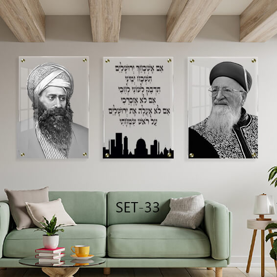 הסט כולל שלוש תמונות זכוכית נפרדות המציגות את דמויותיהם של רבנים נערצים ואת המשפט המרגש "אם אשכחך ירושלים תשכח ימיני":
