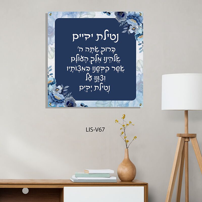 תמונת זכוכית של ברכת נטילת ידיים בעיצוב פרחוני כחול