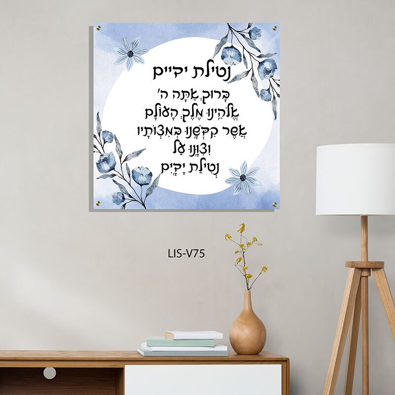 הכניסו נופך של טהרה, רוגע ואלגנטיות לעיצוב הבית עם תמונה מעוצבת של ברכת נטילת ידיים, בכיתוב שחור קלאסי המעוטר בפרחים מרהיבים בגווני כחול ולבן. העיצוב האומנותי שואב השראה מהעולם היהודי ומהטבע הנקי והשלו, ומשלב בין מסורת קדושה לאסתטיקה מודרנית ומרגיעה.