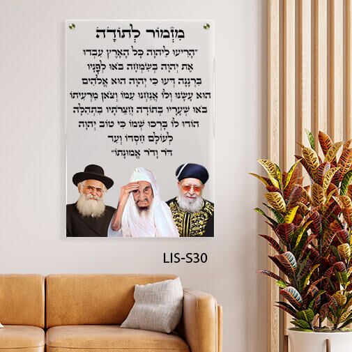 בחרו בדגם LIS-S-S30 והכניסו לחלל שלכם אווירה של אמונה, השראה ויוקרה – עם הדפס איכותי של "מזמור לתודה" ודמויות הרבנים האהובים על רקע שקוף.