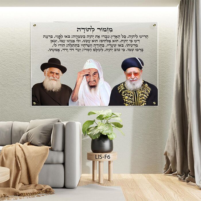 תמונת זכוכית מיוחדת של מזמור לתודה יחד עם דמויותיהם של מרן הרב עובדיה יוסף, הבבא סאלי – הרב ישראל אבוחצירא, והרב יורם אברג’יל, בדגם LIS-F6. השילוב בין המזמור לבין גדולי התורה יוצר תמונה מרשימה שמכניסה לבית תחושה של קדושה, הודיה וחיזוק רוחני.
