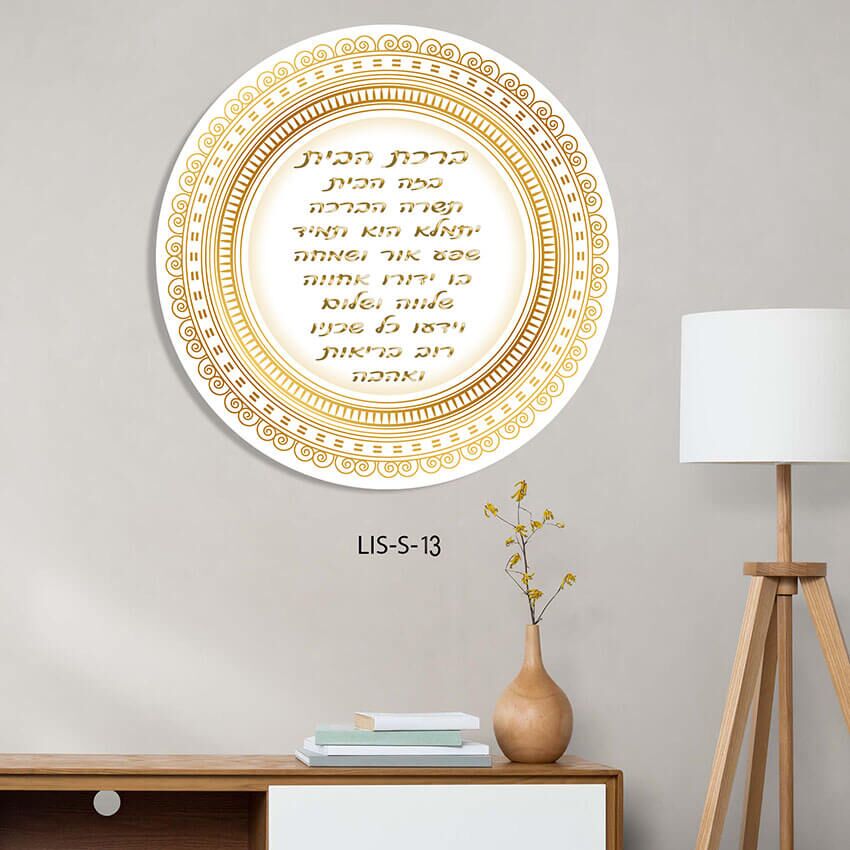 תמונת זכוכית עגולה "ברכת הבית" ברקע לבן עם מסגרת זהב מעוטרת – דגם LIS-S-13