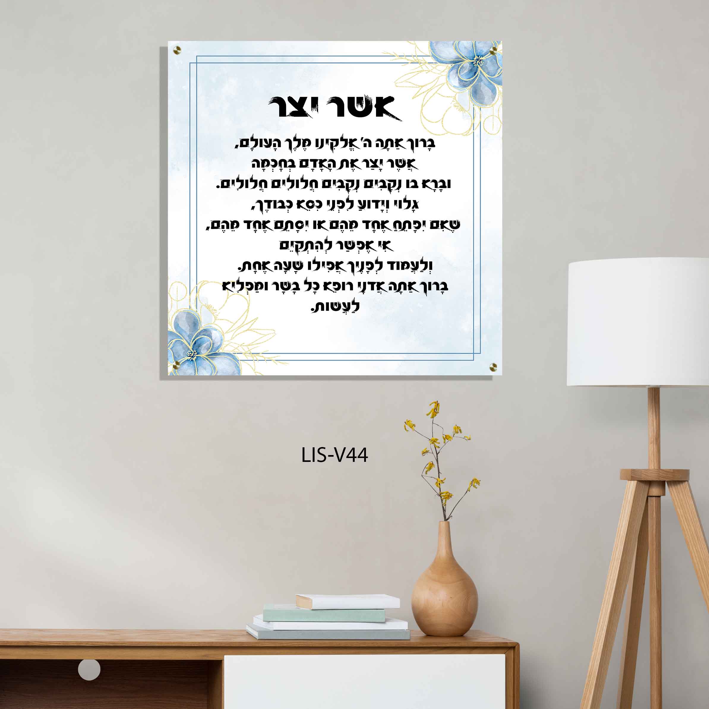תמונת זכוכית איכותית וברמת גימור גבוהה, המציגה את ברכת אשר יצר בעיצוב אלגנטי בגווני כחול-לבן.