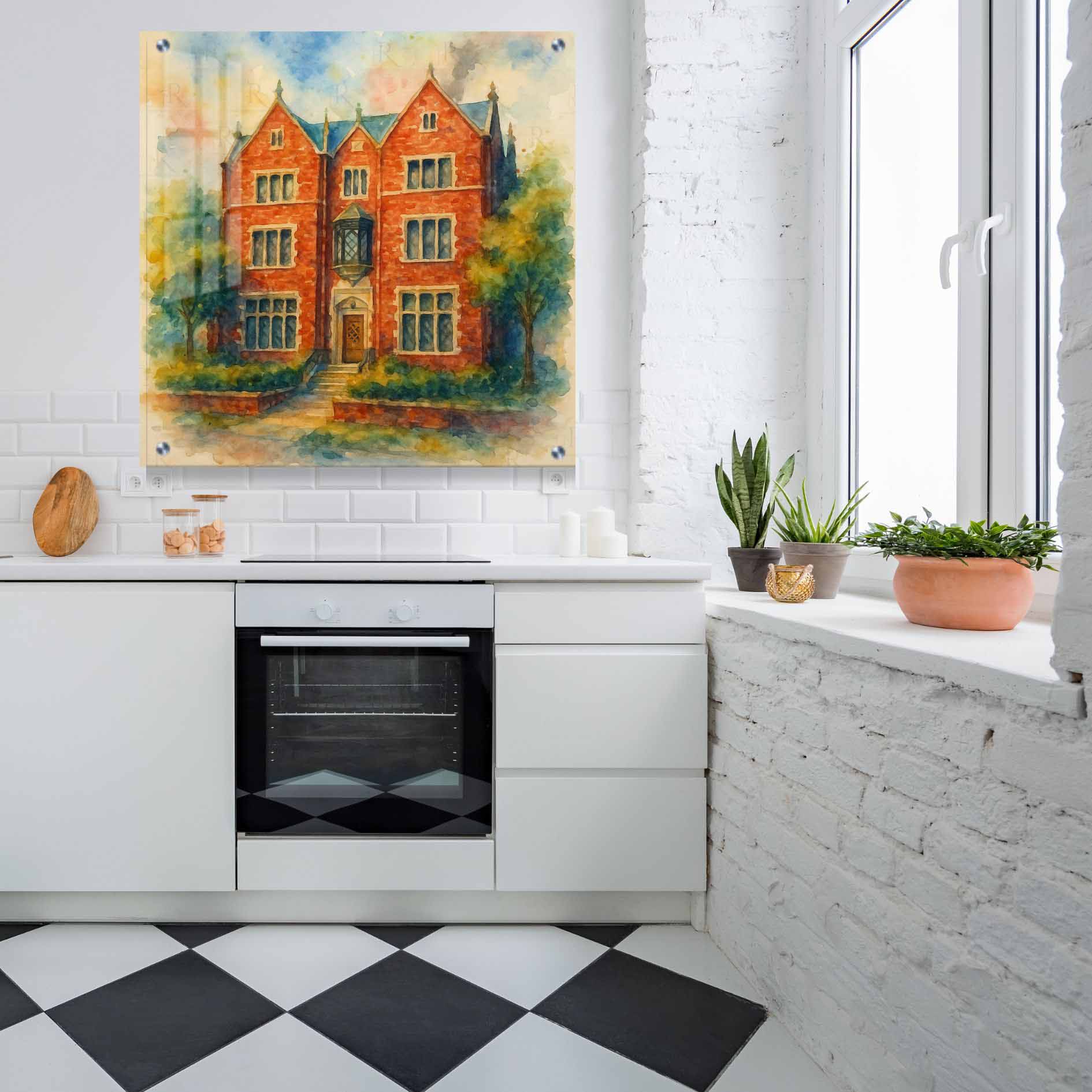 תמונת זכוכית יוקרתית של ביתו המפורסם של הרבי מלובביץ׳ – 770, מעוצבת בסגנון ציור מים עדין.