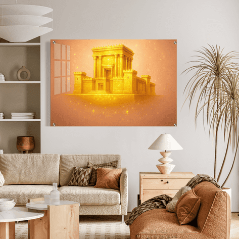 תמונת זכוכית מרהיבה של בית המקדש בעיצוב מוזהב, על רקע כתמתם ומנצנץ המעניק עומק ואור. ההדפסה מתבצעת על זכוכית מחוסמת Extra Clear בעובי 6 מ"מ, בטכנולוגיית UV מתקדמת, לקבלת חדות, ברק ועמידות לשנים רבות.