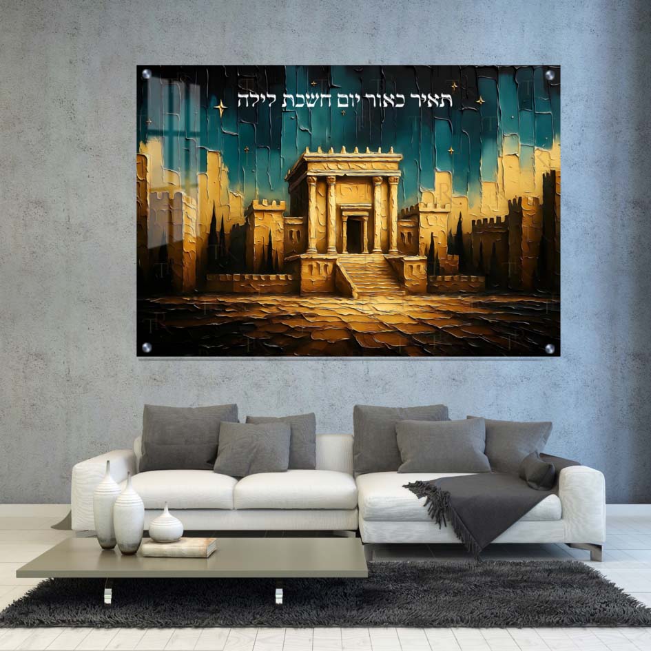 תמונה של בית המקדש מצוירת בסגנון צבעי שמן. בשעות הלילה. עם אור זהוב המאיר את העזרה והחומות. מעל המקדש נכתב: “תאיר כאור יום חשכת הלילה”. משפט שמעניק לתמונה נקודת תקווה וחום. הרקע הכהה מדגיש את הזהבים ומעניק נוכחות אלגנטית לכל חלל. זו תמונת בית המקדש לסלון שמרגישה כמו גלריה בבית, ומתאימה במיוחד לקולקציית יודאיקה תמונות עדכניות.