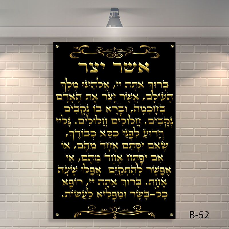 הכניסו את תדר ההודיה, השמירה והבריאות אל המרחב שלכם עם יצירת אומנות יוקרתית, דרמטית ומלאת הוד. היצירה מציגה את "ברכת אשר יצר" – הברכה היהודית העוצמתית ביותר לבקשת בריאות איתנה והודיה על פלא גוף האדם, המעוצבת באותיות זהב בוהקות, מנוקדות ומהודרות, על גבי רקע שחור עמוק ואטום.