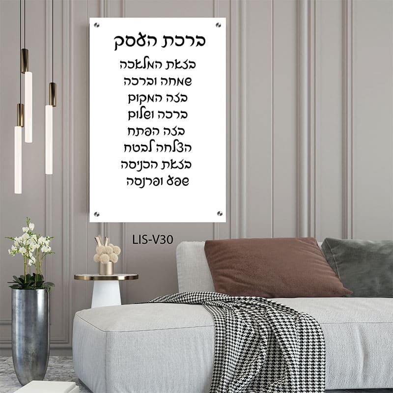 דגם LIS-V30 מציג את נוסח ברכת העסק הכתובה באותיות שחורות ברורות על רקע לבן נקי (או שקוף לפי בחירה), מודפסת על זכוכית מחוסמת Extra Clear בעובי 6 מ"מ – איכות בלתי מתפשרת ועמידות לשנים רבות.