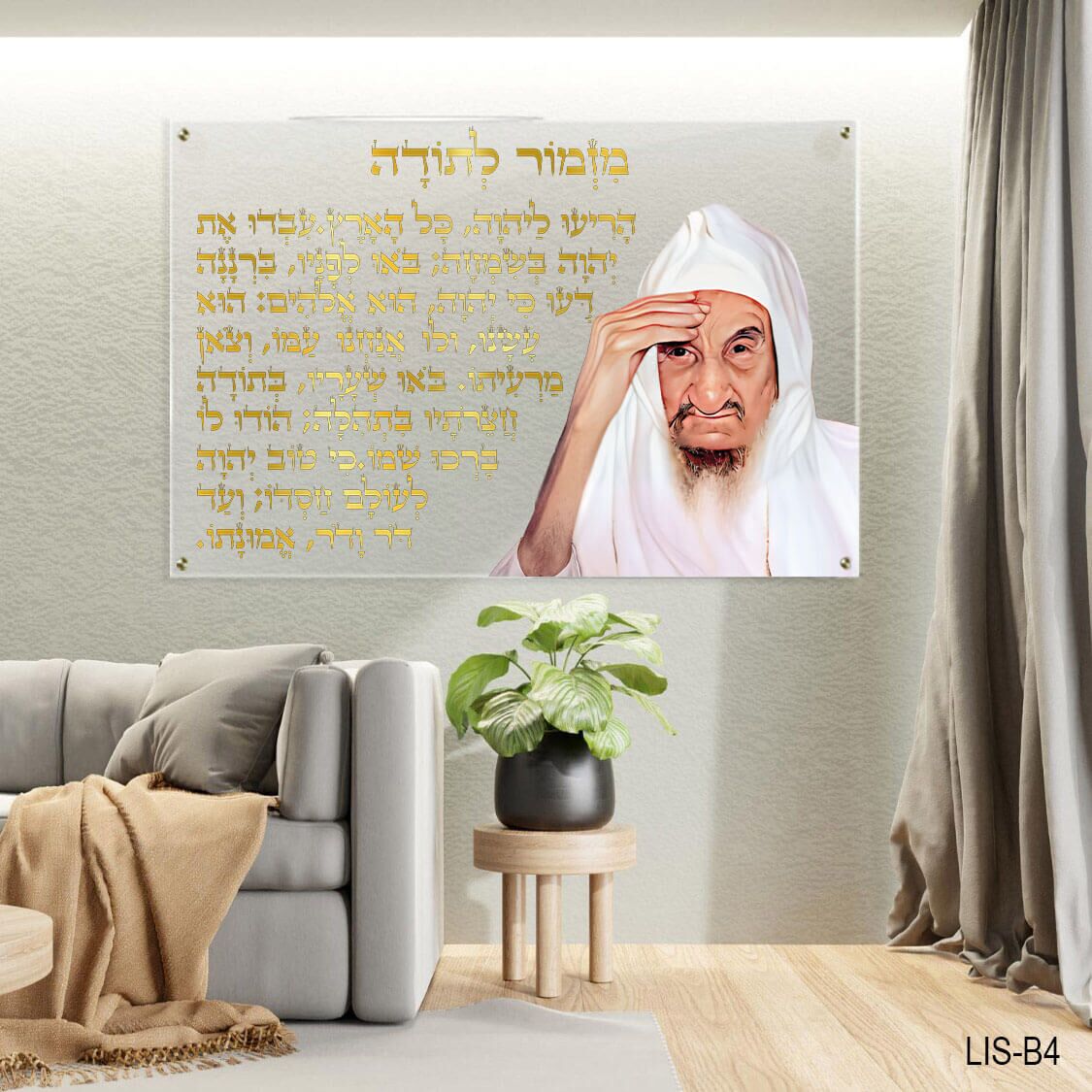 תמונת זכוכית אלגנטית ומרשימה במיוחד. המשלבת השראה רוחנית עם עיצוב מודרני ונקי. בתמונה מופיעה דמותו הקדושה של הצדיק הבבא סאלי (הרב ישראל אבוחצירא) יחד עם מזמור לתודה. טקסט מלא סגולה, עוצמה וברכה – בכתב מהודר בגוון זהב מרשים.