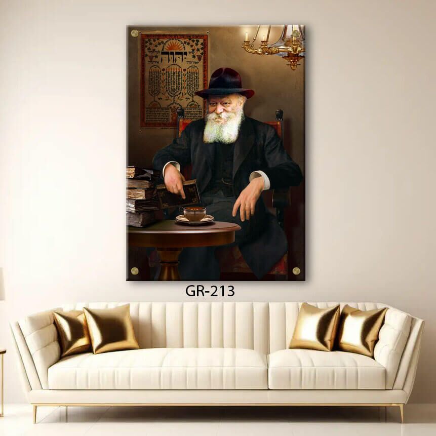 התמונה מציגה את הצדיק רבי מנחם מנדל שניאורסון (הרבי מלובביץ') יושב על כיסא ליד שולחן וכוס תה, ברגע אותנטי ומעורר מחשבה. ההדפסה הישירה על זכוכית מחוסמת אקסטרה קליר בעובי 6 מ"מ מבטיחה איכות תמונה גבוהה, ברק יוצא דופן ותחזוקה קלה, המתאימים לכל סלון, פינת עבודה או משרד.