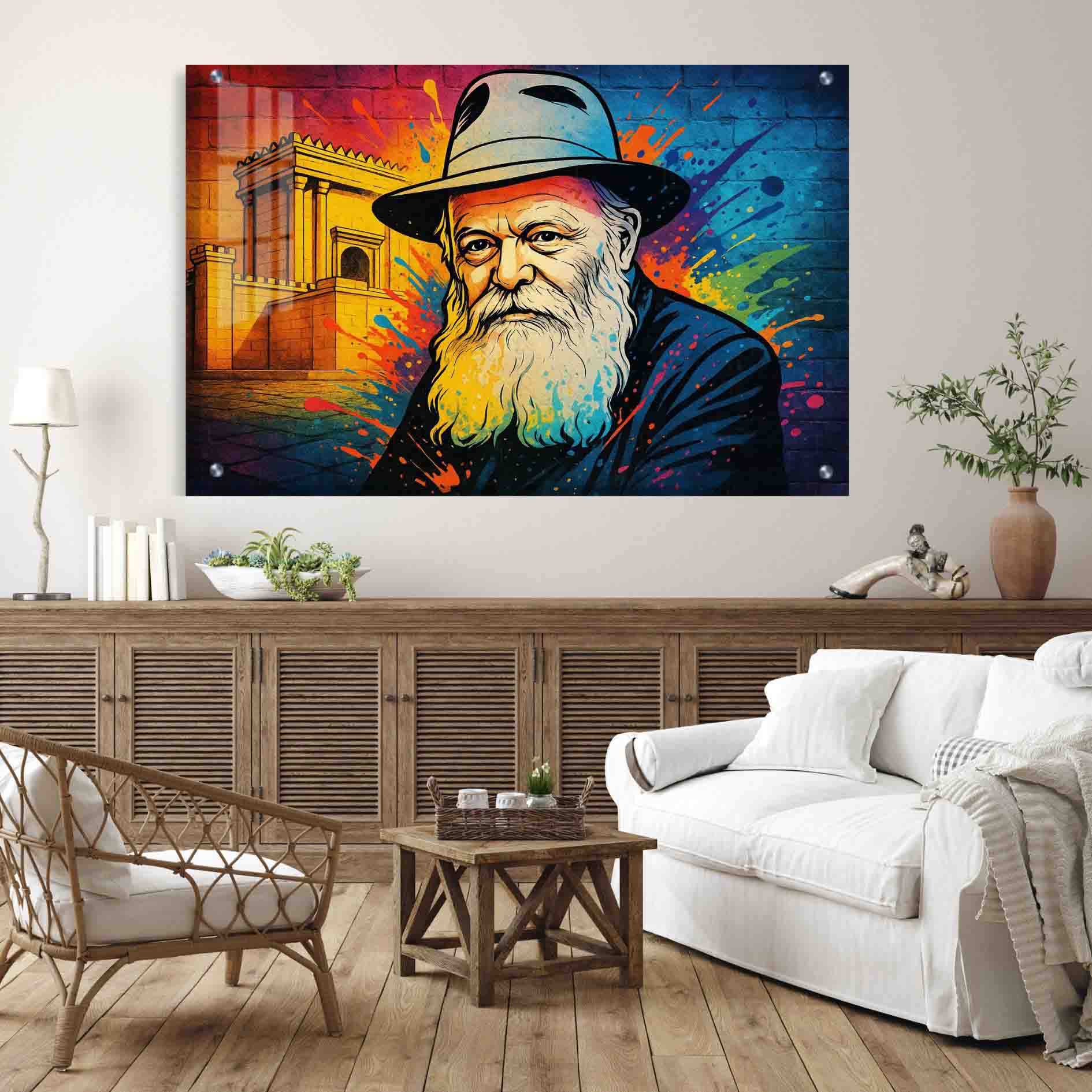 תמונת זכוכית של צדיקים בסגנון פופ־ארט שמביאה לקיר שלכם עומק רוחני, צבע וסיפור יהודי שממשיך להשפיע עד היום.