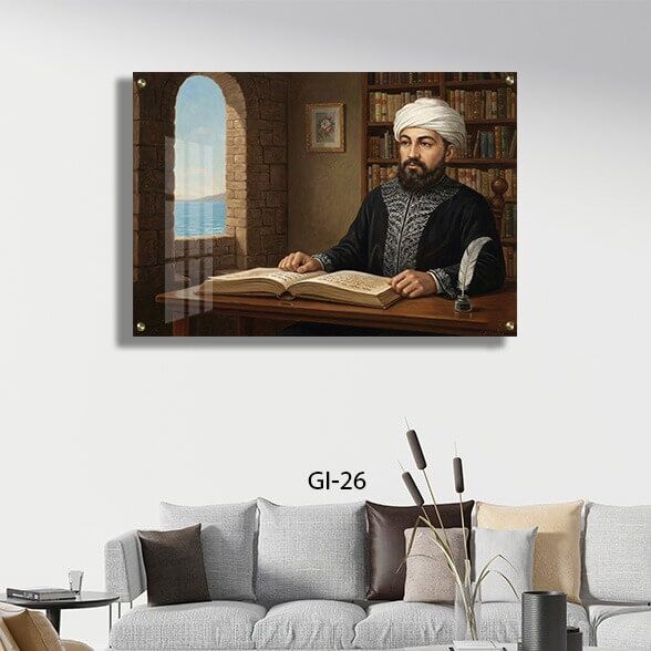 בציור האומנותי, נראה הצדיק שקוע בלימוד ובכתיבה אל מול ספר פתוח, כשלצידו קסת דיו ונוצה. הרקע העשיר, הכולל ספריית קודש עמוסה מחד וחלון אבן קשתי המשקיף אל נוף ים כחול ורגוע מאידך, משרה בחלל החדר אווירה עמוקה של השראה, הרחבת הדעת ושלווה אינסופית. זוהי תמונה של צדיקים קלאסית ועוצרת נשימה, מושלמת לספרייה התורנית, לחדר העבודה, לקליניקה או לסלון, המזכירה מדי יום את החיבור הנצחי לשורשי החוכמה והאמונה היהודית. הדפסת היצירה בטכנולוגיית תמונות צדיקים מזכוכית מבטיחה שפרטי הציור, גווני העץ החמים והכחול העמוק של הים יקבלו ברק קריסטלי מרהיב ומראה "מרחף" ויוקרתי שאינו דוהה עם השנים.
