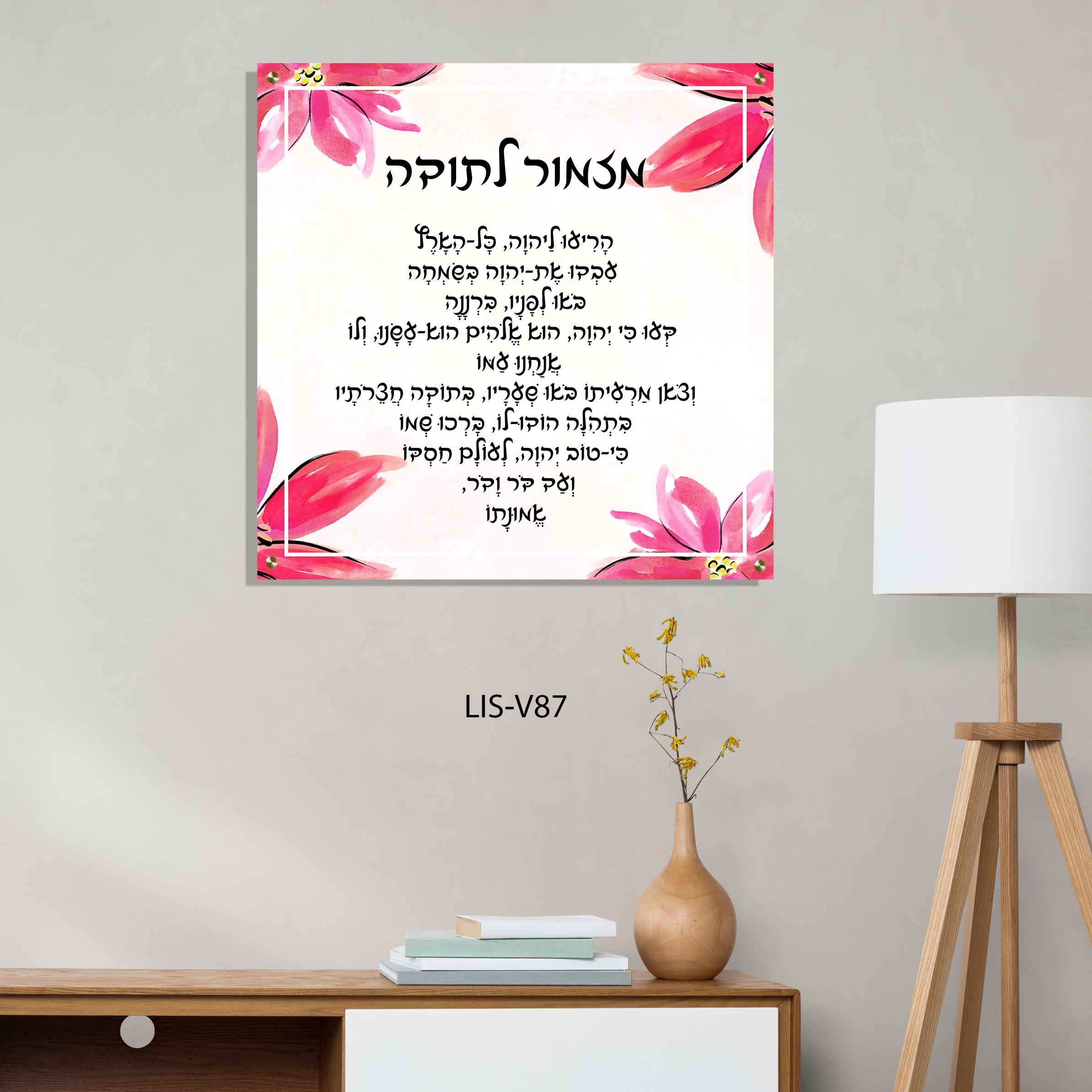 תמונה של מזמור לתודה בעיצוב זה מצטרפת לעולם תמונות יודאיקה מודרני, ומשלבת מסורת עם אסתטיקה עדינה – מזמור לתודה תמונה מזכוכית שמוסיפה משמעות לכל קיר.